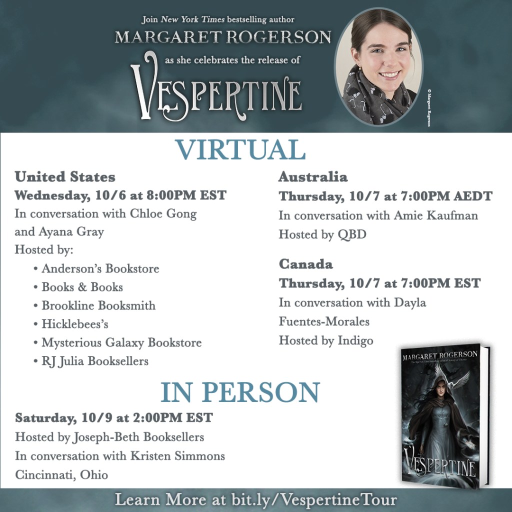 Up for grabs on the book blog tour is two (2) copies of VESPERTINE by Margaret Rogerson, one a physical finished copy and one a digital copy. Open USA only.